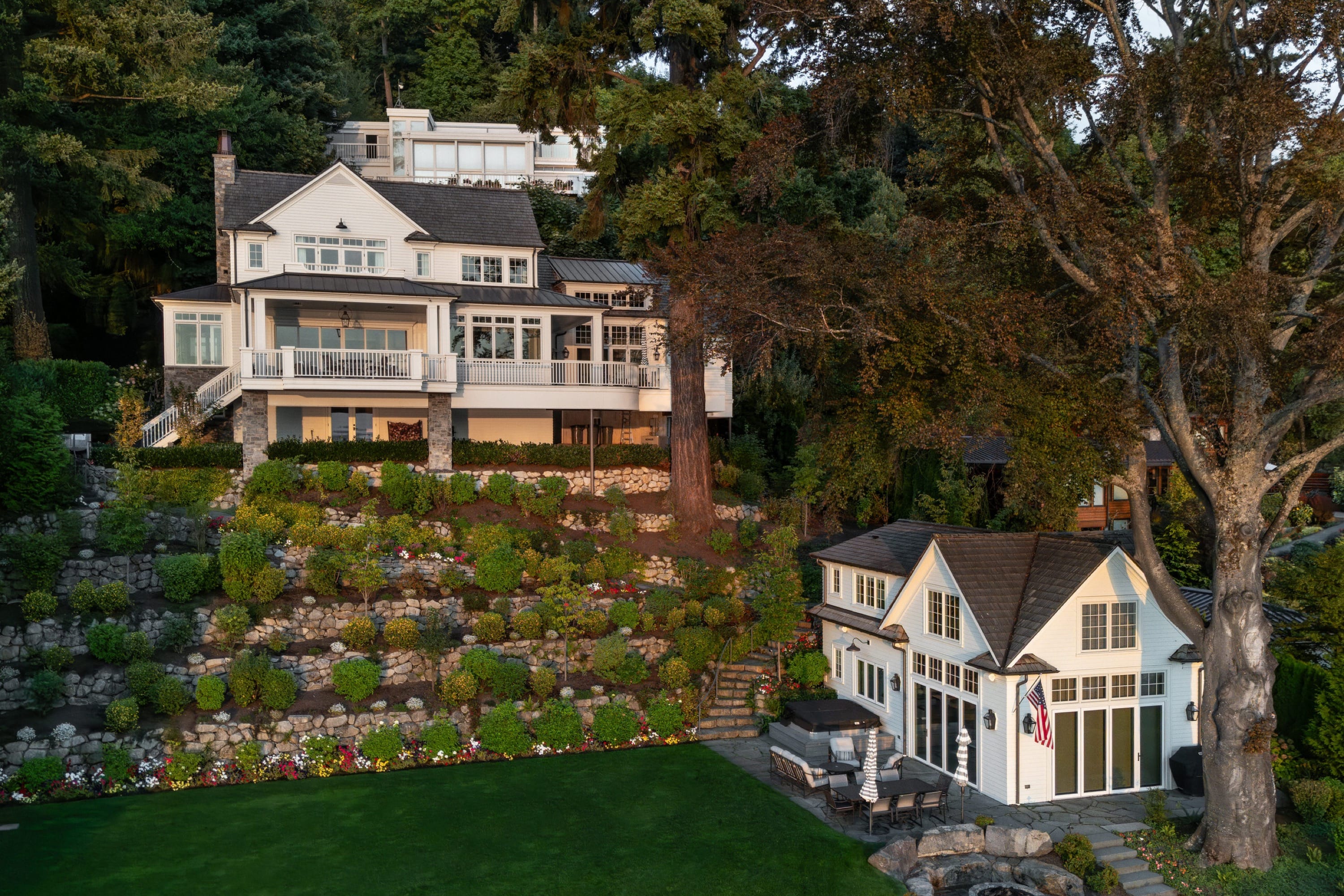The small cottage that once stood here served as the muse for this Lake Washington home. The project called for Ripple Design Studio’s full breadth of creativity to meet the site’s complex requirements while maintaining the client’s vision of a sophisticated cottage. Nestled into the hillside, the home makes the most of the sparkling lake views. Detailed millwork and soft wall coverings are carried from the grand entrance throughout the interior spaces for a warm, cohesive feel. Thoughtful landscaping sweeps to the water’s edge where the cabana—a mini version of the home—offers a more playful, laid-back sensibility for entertaining and overnight guests.