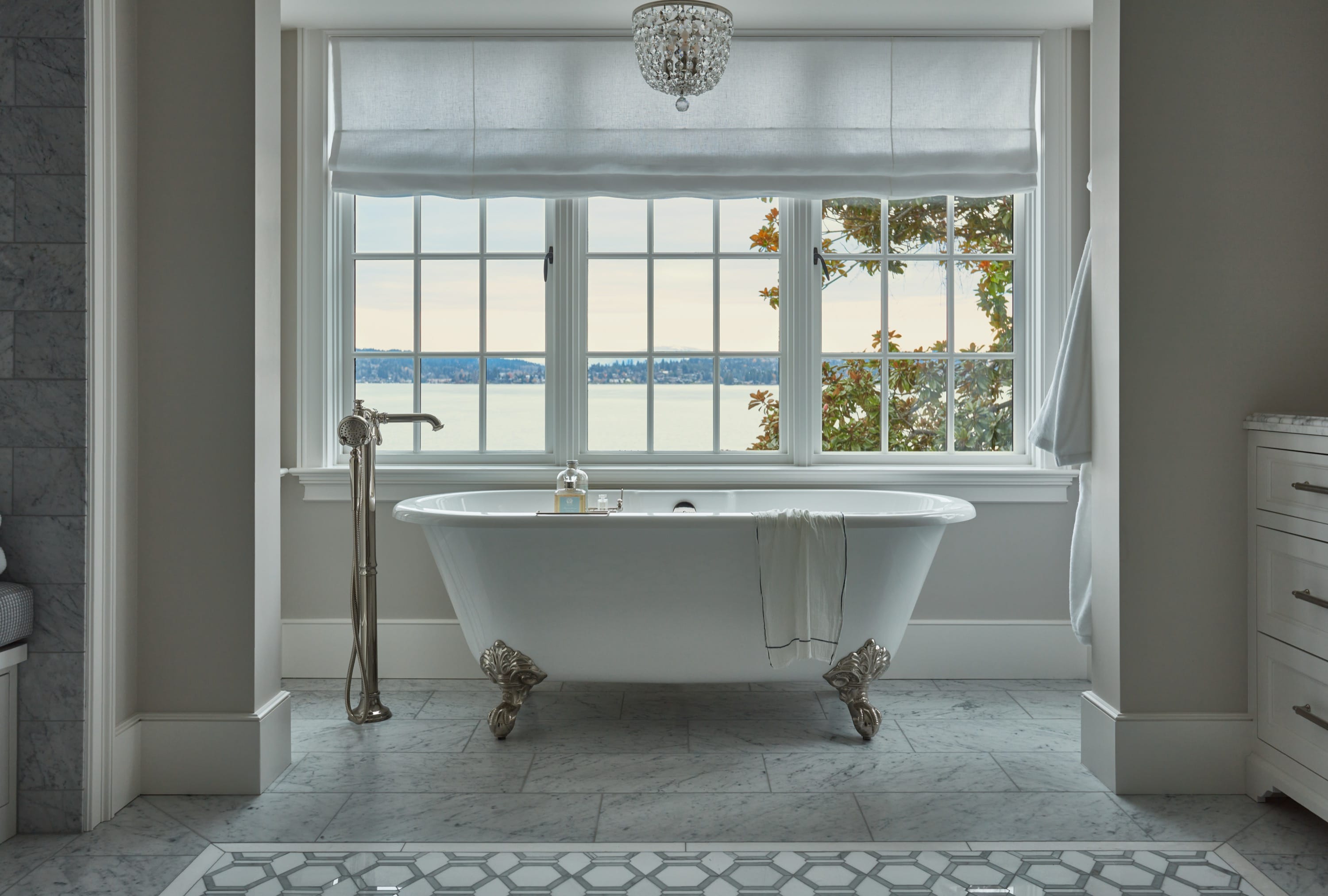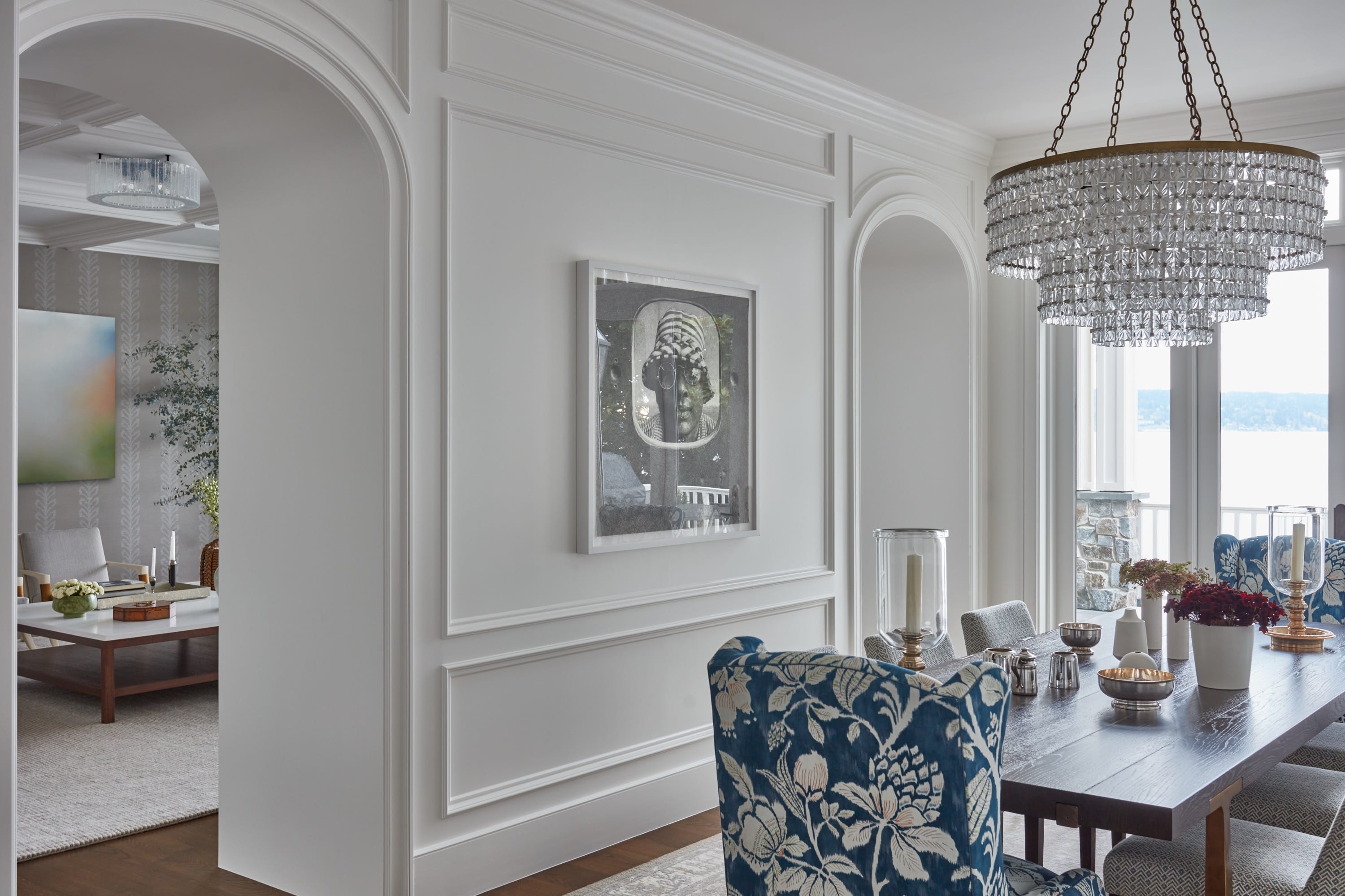 This 7,000-square-foot remodel celebrates its waterfront location with a floor plan that revolves around the views. (Even the laundry room enjoys a peek at Lake Washington.) Traditional design elements—including detailed millwork, refined wall coverings, and marble—are paired with a neutral color palette and textured fabrications. The light-filled interior transitions beautifully to the outdoors with multiple decks for entertaining family and friends. Landscaping offers room for playing sports while providing easy access to the dock.